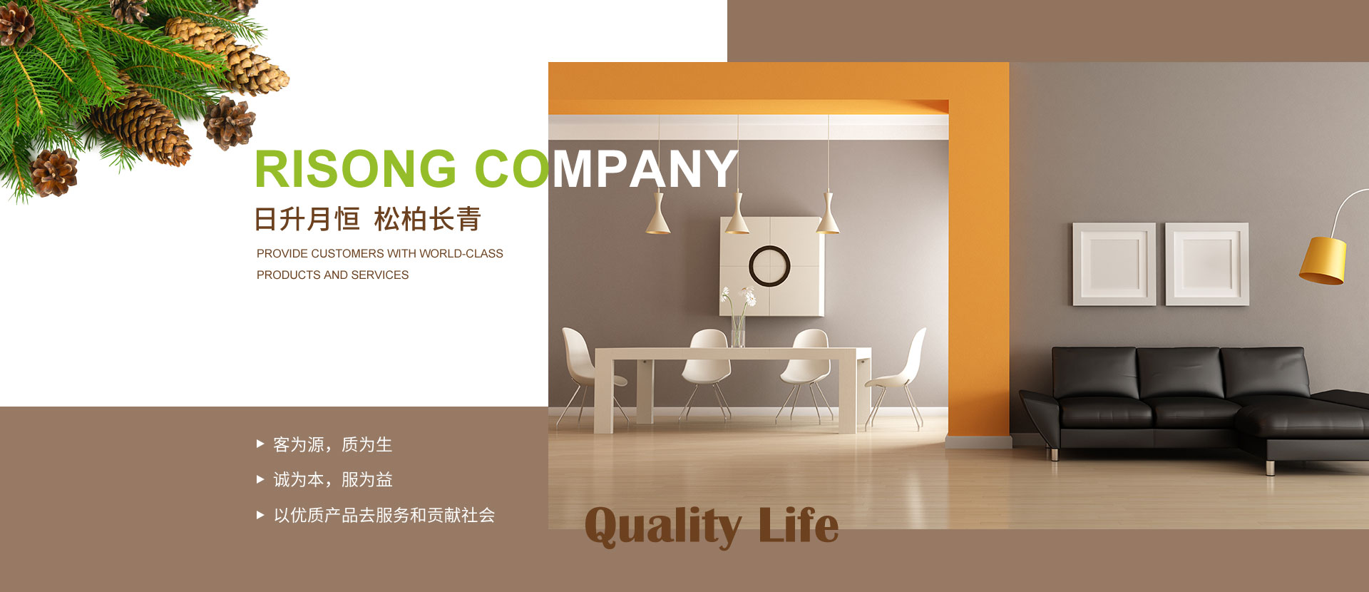 大連日松將一直秉承“以?xún)?yōu)質(zhì)產(chǎn)品去服務(wù)和貢獻(xiàn)社會(huì)”的經(jīng)營(yíng)宗旨;“客為源,質(zhì)為生、誠(chéng)為本、服為益”的經(jīng)營(yíng)理念;達(dá)到“使用者、銷(xiāo)售者、制造者”三者并存共榮之經(jīng)營(yíng)思路;全體日松人將以“熱情、禮貌、快捷、準(zhǔn)確”的行動(dòng)指南,不懈努力的為每一位客戶(hù),提供行業(yè)內(nèi)一流的高端、環(huán)保、舒適、健康的產(chǎn)品和細(xì)節(jié)服務(wù),打造出適合“您”的優(yōu)質(zhì)家居住宅環(huán)境。